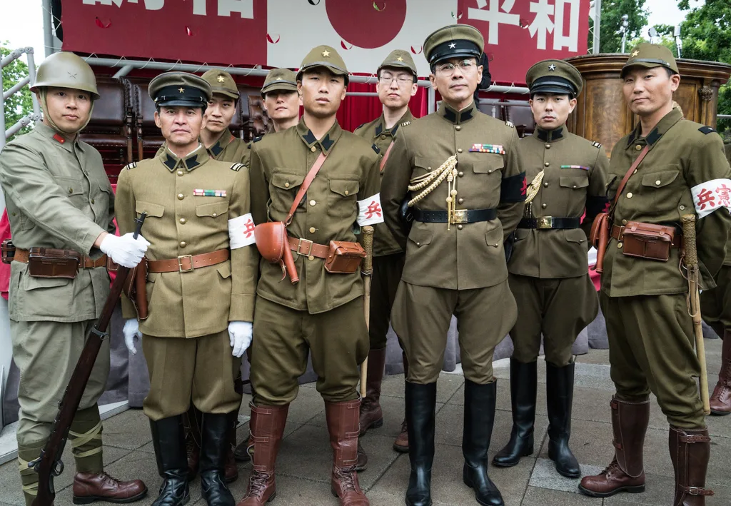 The Japanese uniforms were largely based on historical uniforms of the end of World War II, and also it so happens that the simplicity of the Japanese military style balanced beautifully with the swagger of Nazi uniforms. Japanese uniform silhouettes, ribbons, and medals are more restrained and streamlined, and there is less adornment in general. Also the color world is much tighter: the Japanese are all in shades of very cool, green-toned khaki, wheres the Nazi uniforms are deep black, the famous Nazi grey, and nutty tan. The Japanese rank system of red, black and gold has a simpler vocabulary than the multi-tiered system of Nazi rank; Japanese medals are sparsely worn, and based on classic historical symbols, like the Chrysanthemum.”
