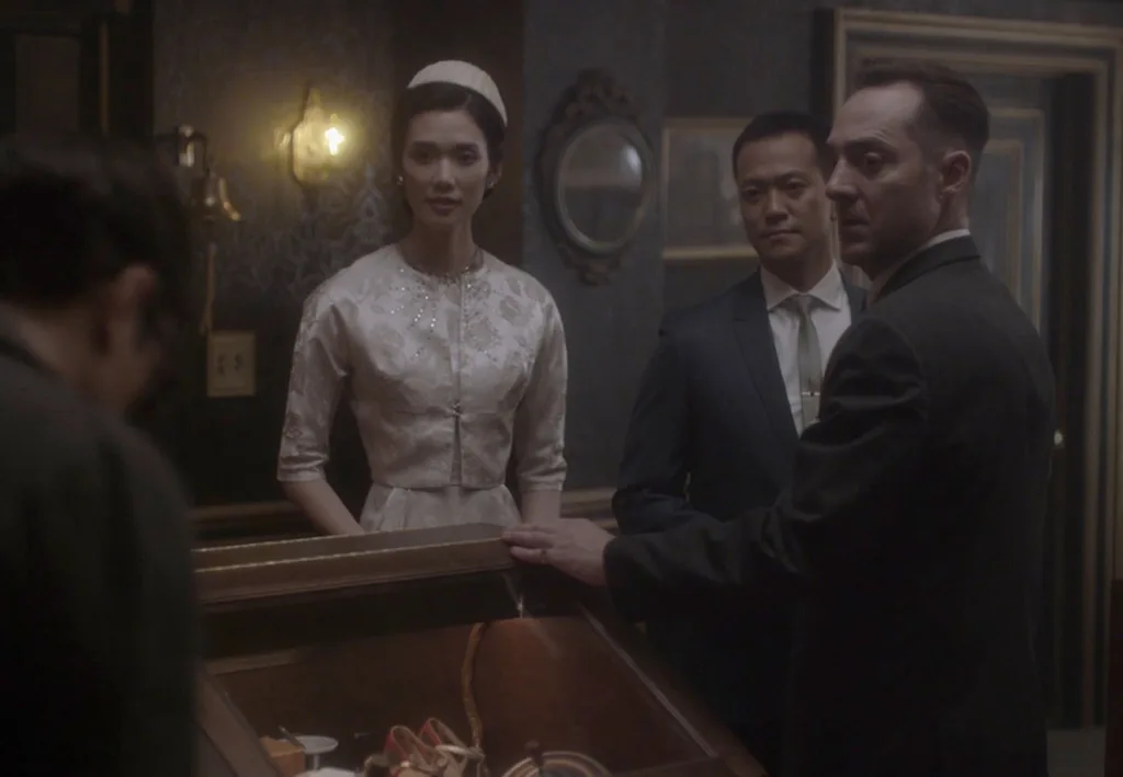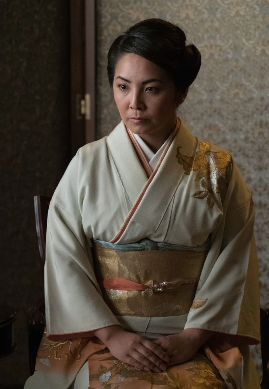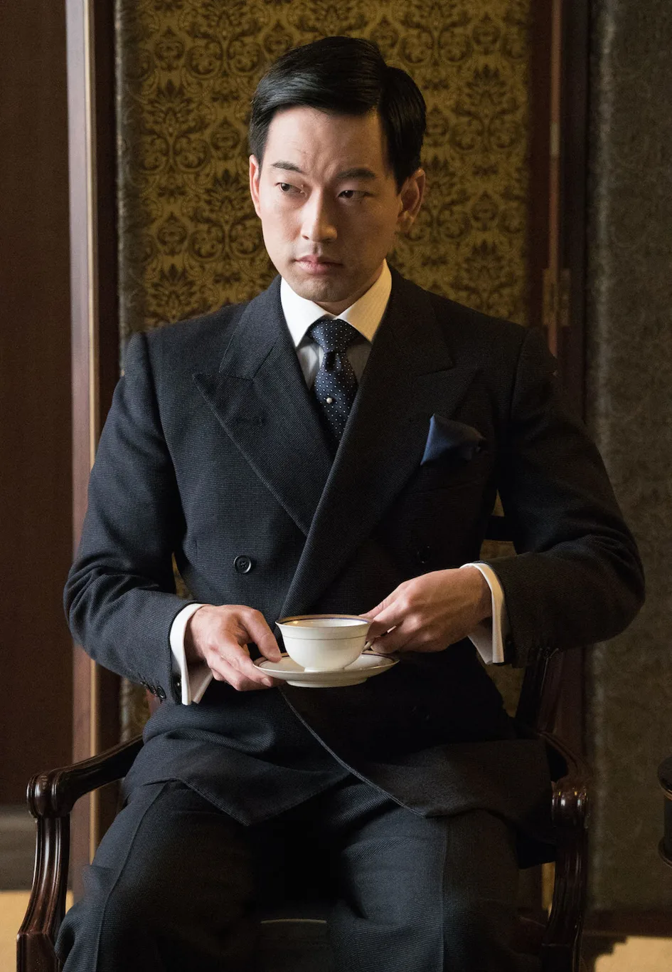 AF: “For the Japanese Crown Prince and Princess, I did exhaustive research on the historical couple, Crown Prince Akihito and Crown Princess Michiko of Japan, who were Japan’s equivalent of JFK and Jackie in the early 1960s. My goal was to use them as my strongest inspiration, and follow their style cues: the young Prince’s dapper, bespoke Westernized suits, and the demure Princess’ striking but feminine kimono. In order to really emphasis the dominance of Japanese culture in the world of MITHC San Francisco, we chose to keep the Princess only in kimono for her state visit, instead of showing her in sophisticated Western dress, which she immaculately wore regularly in real life. I relied heavily on photographs of their many state visits, during which the Princess often did wear kimono, and tried to respectfully emulate small but charming details of their presentation: for instance, the scale and feel of the patterns the Princess favored, the pearl and diamond brooch the Princess wore discreetly on her Obi tie, and the Prince’s penchant for a luxe 1940 silhouette and silk hankies.