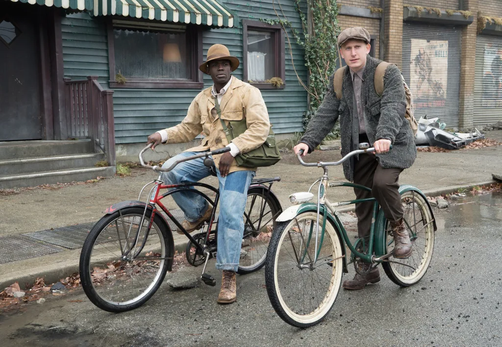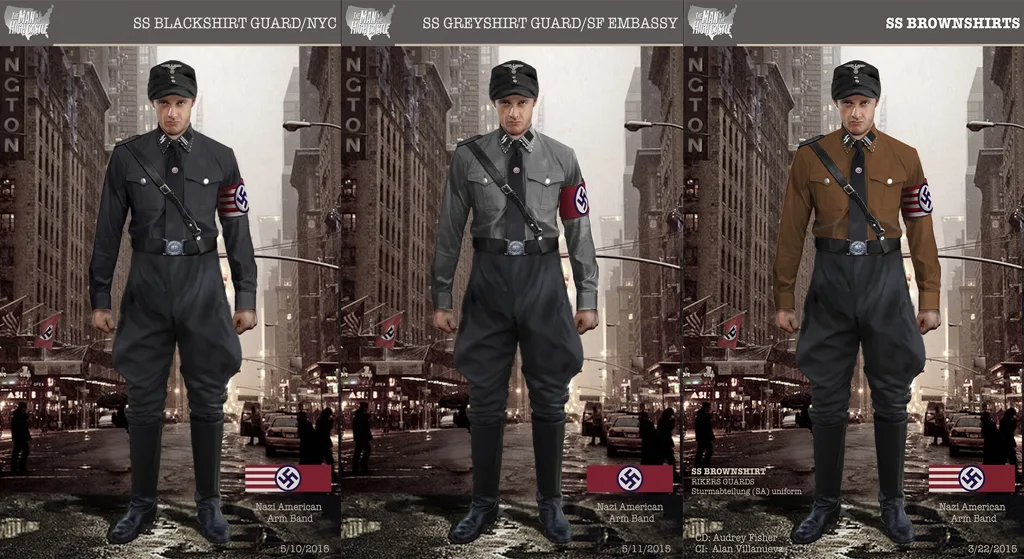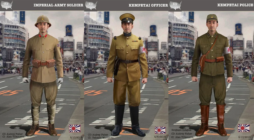 As far as silhouette and texture: the Japanese domain of San Francisco wields less power than the Nazi Reich, therefore the silhouettes are softer, slightly less imposing, and we see the class hierarchy in the wear-and-tear of the clothes.
