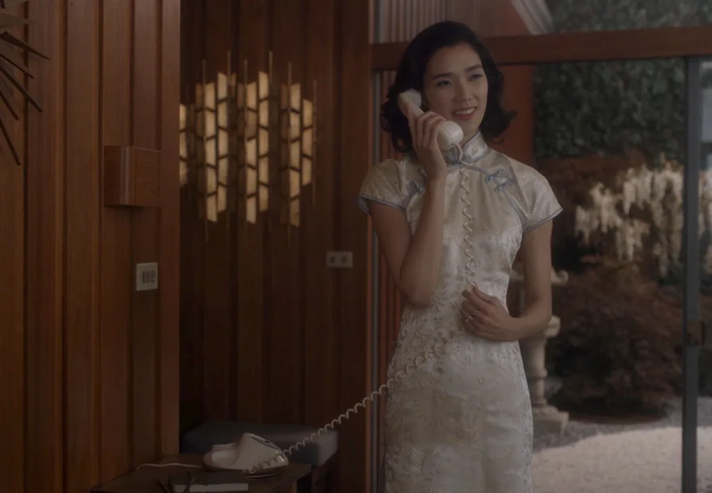 With Betty I was given free rein: she’s a chic fashionista who collects looks from all the colonies of Japan as well as the latest couture from Japan and Berlin, hence she debuts in a very Jackie cream silk suit and pillbox, mesmerizing Childan. Later at home we see her in a hot pink embroidered Moroccan vest, a luxe dupioni dinner gown in cerulean blue, and then both a silver and then a midnight silk Cheongsam. She delights in her youth, beauty and nobility.”