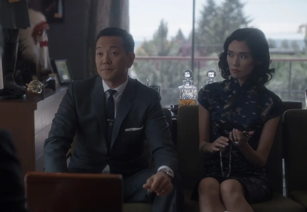 AF: “For the Japanese Crown Prince and Princess, I did exhaustive research on the historical couple, Crown Prince Akihito and Crown Princess Michiko of Japan, who were Japan’s equivalent of JFK and Jackie in the early 1960s. My goal was to use them as my strongest inspiration, and follow their style cues: the young Prince’s dapper, bespoke Westernized suits, and the demure Princess’ striking but feminine kimono. In order to really emphasis the dominance of Japanese culture in the world of MITHC San Francisco, we chose to keep the Princess only in kimono for her state visit, instead of showing her in sophisticated Western dress, which she immaculately wore regularly in real life. I relied heavily on photographs of their many state visits, during which the Princess often did wear kimono, and tried to respectfully emulate small but charming details of their presentation: for instance, the scale and feel of the patterns the Princess favored, the pearl and diamond brooch the Princess wore discreetly on her Obi tie, and the Prince’s penchant for a luxe 1940 silhouette and silk hankies.